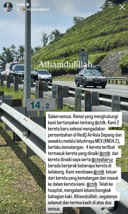 Insiden tersebut mula tular di media sosial selepas seorang pengguna berkongsi keadaan kenderaan yang dipercayai dinaiki penyanyi terkenal itu dalam keadaan rosak teruk di tepi lebuh raya.