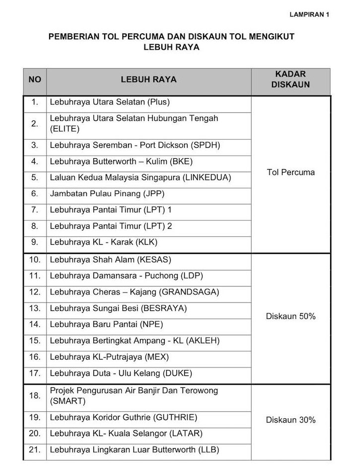 Pemberian tol percuma melibatkan lebuh raya milik Kumpulan PLUS Malaysia Berhad (PLUS) yang menghubungkan jaringan lebuh raya utara-selatan, dan Anih Berhad (ANIH) yang menghubungkan lebuh raya pantai timur (LPT).”