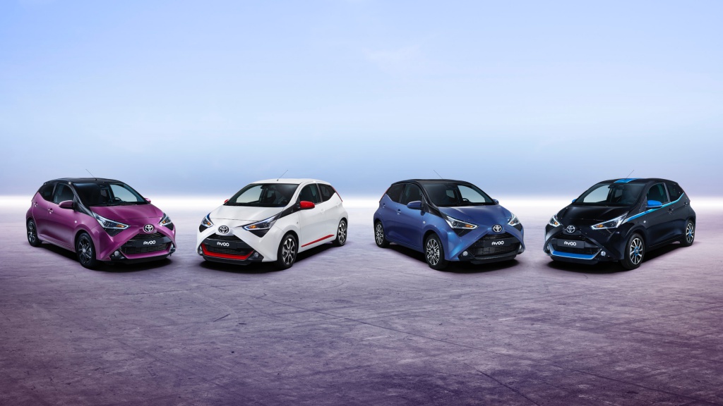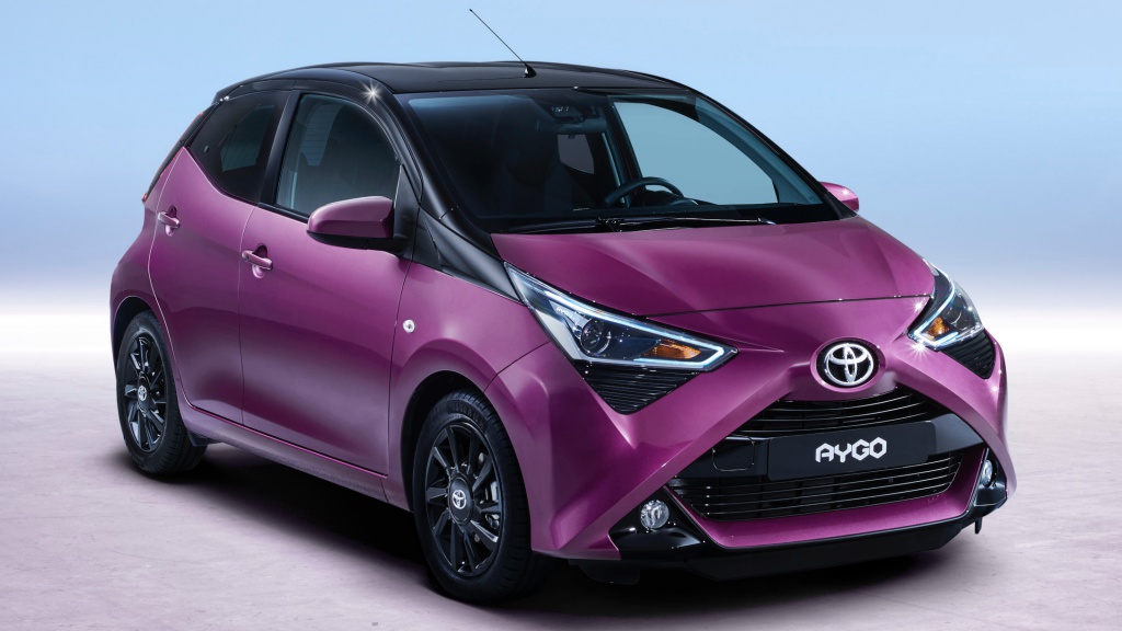 - Aygo X-Cite – Warna magenta didatangkan dengan warna hitam pada luaran, dan rim hitam serta kabin juga berwarna magenta. Varian ini menampilkan kerusi khas trim benang magenta.
