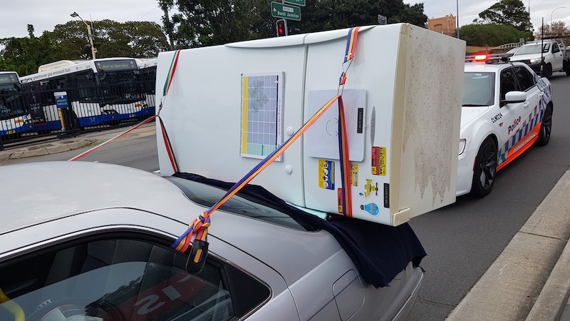 Saman dikeluarkan atas kesalahan membawa muatan dengan cara membahayakan pengguna jalan raya lain. Polis NSW turut mengarahkan pemandu Camry itu menghubungi individu lain supaya dibawakan kenderaan yang sesuai untuk mengangkut peti sejuk tersebut.
