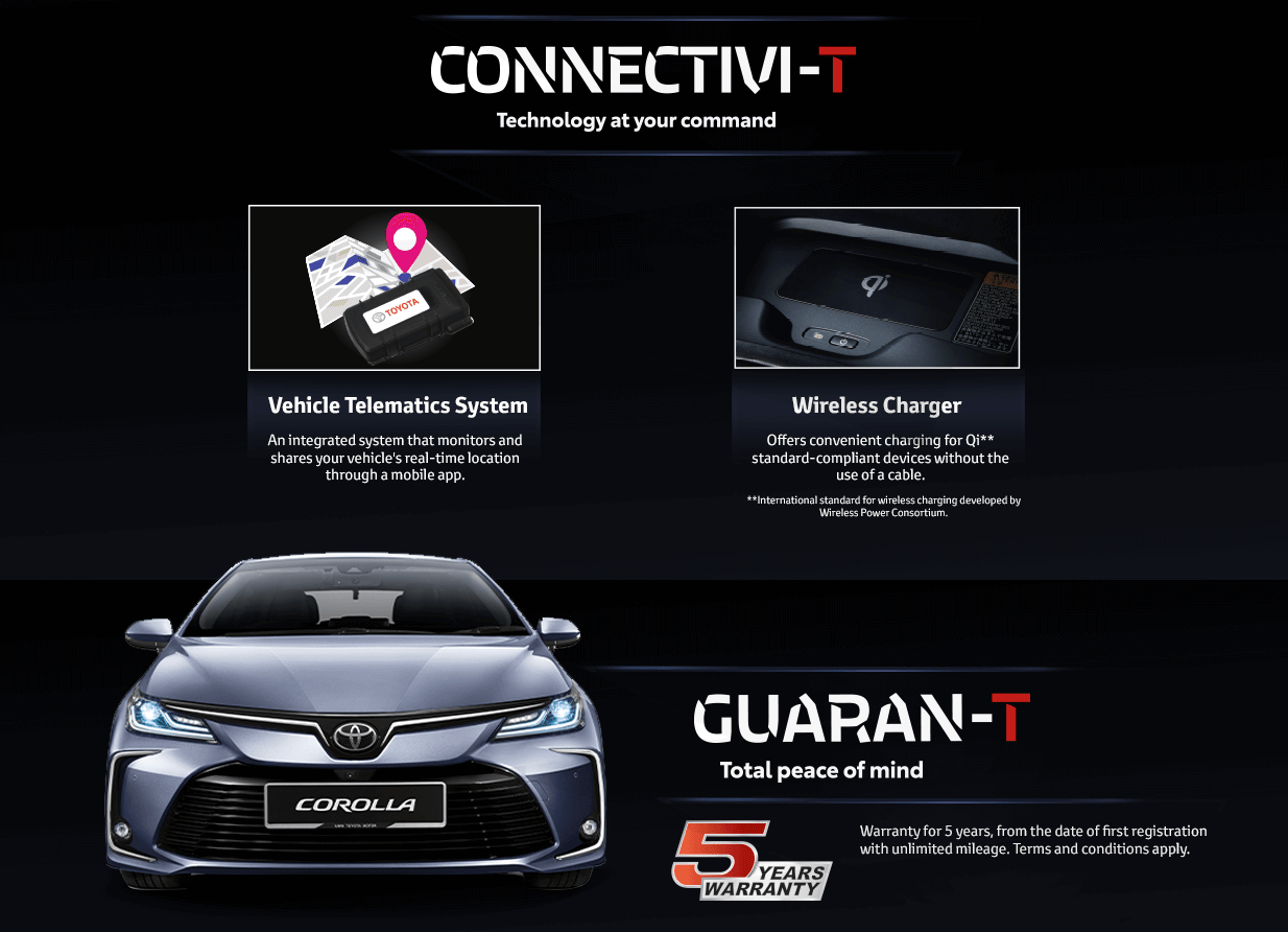 Corolla Altis serba baharu ini sekali ialah pakej waranti 5 tahun tanpa had perbatuan, tertakluk terma dan syarat.