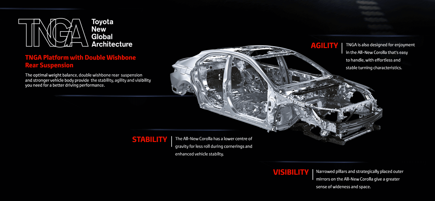 Corolla Altis serba baharu dibangunkan berasaskan platform Arkitektur Global Baharu Toyota (TNGA), GA-C yang menawarkan pengendalian lebih tangkas dan kawalan selekoh mantap, pusat graviti rendah untuk lebih kestabilan, dan pilar kompak untuk visual lebih lebar dan luas.