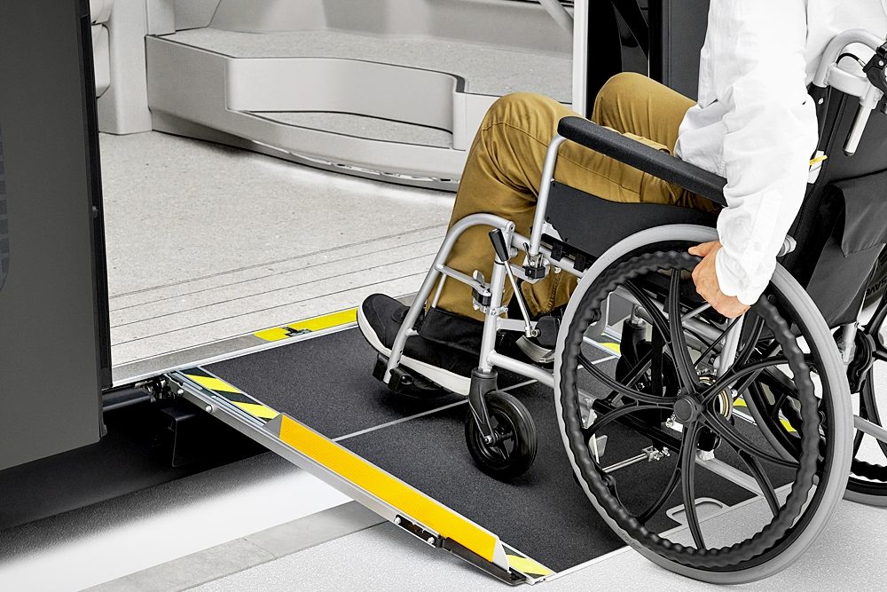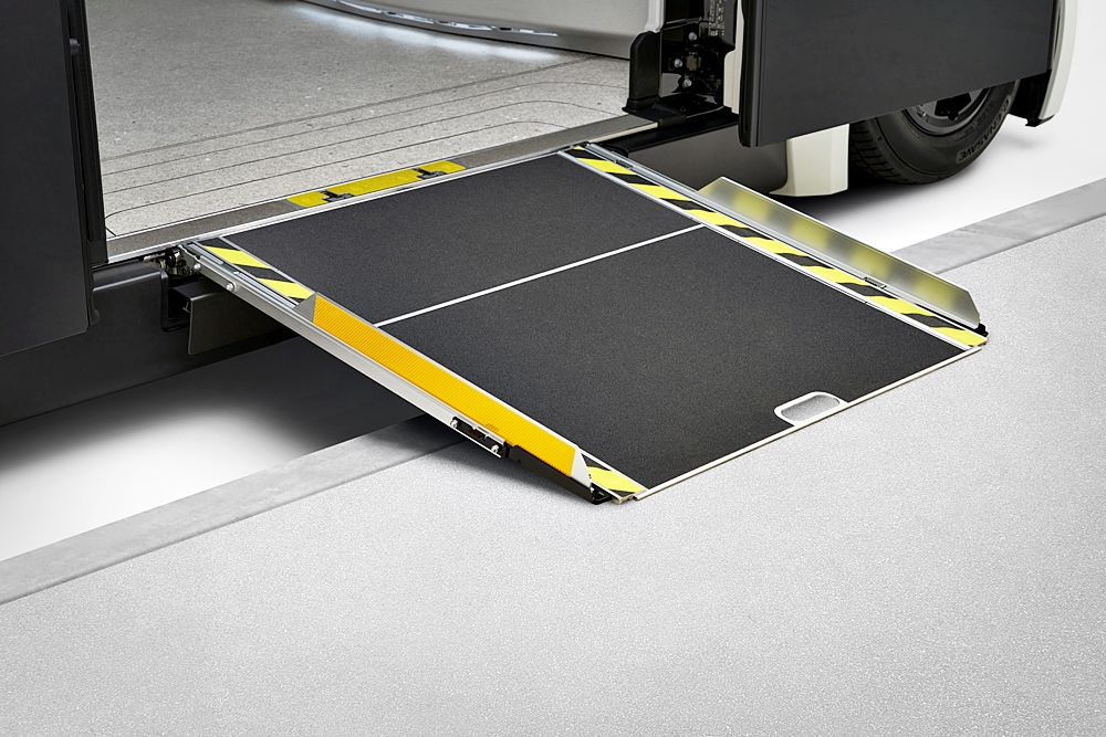 - Pintu gelangsar lebar dan tanjakan (ramp) elektrik untuk pengguna berkerusi roda