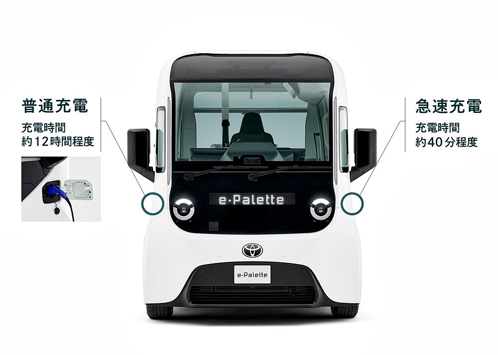 Toyora e-Palette menggunakan pengecasan standard (AC) dan pantas (DC), serta boleh membekalkan tenaga elektrik ketika tidak bergerak yang sesuai sebagai sumber kuasa kecemasan ketika bencana.