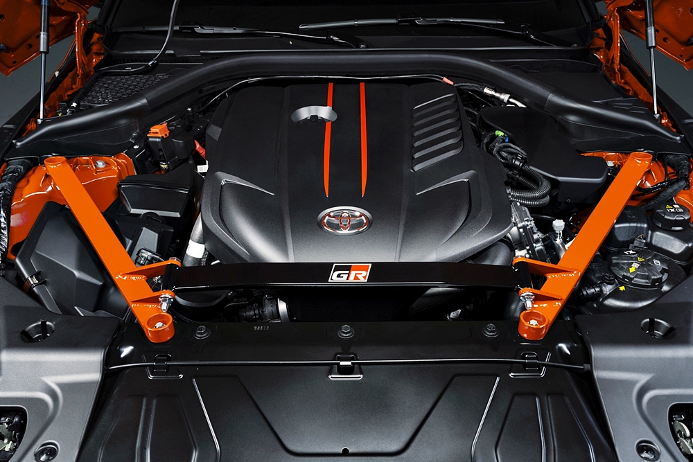 Toyota GR Supra 45th Anniversary Edition (2024) dijana enjin 6-silinder sebaris 3.0L Turbo B58 berkuasa 382hp dan tork 499Nm. Bahagian enjin dipasang braket strut 45th Anniversary Edition Mikan Blast yang memaparkan logo Toyota GAZOO Racing.