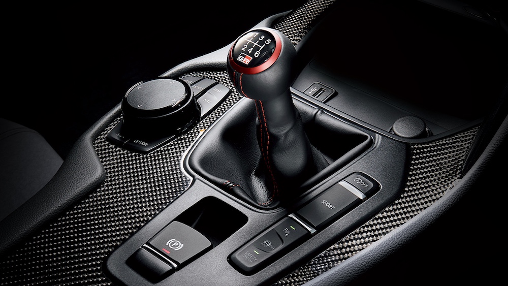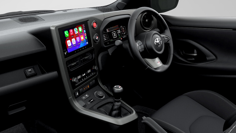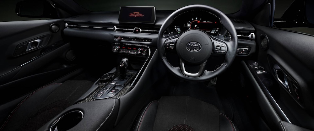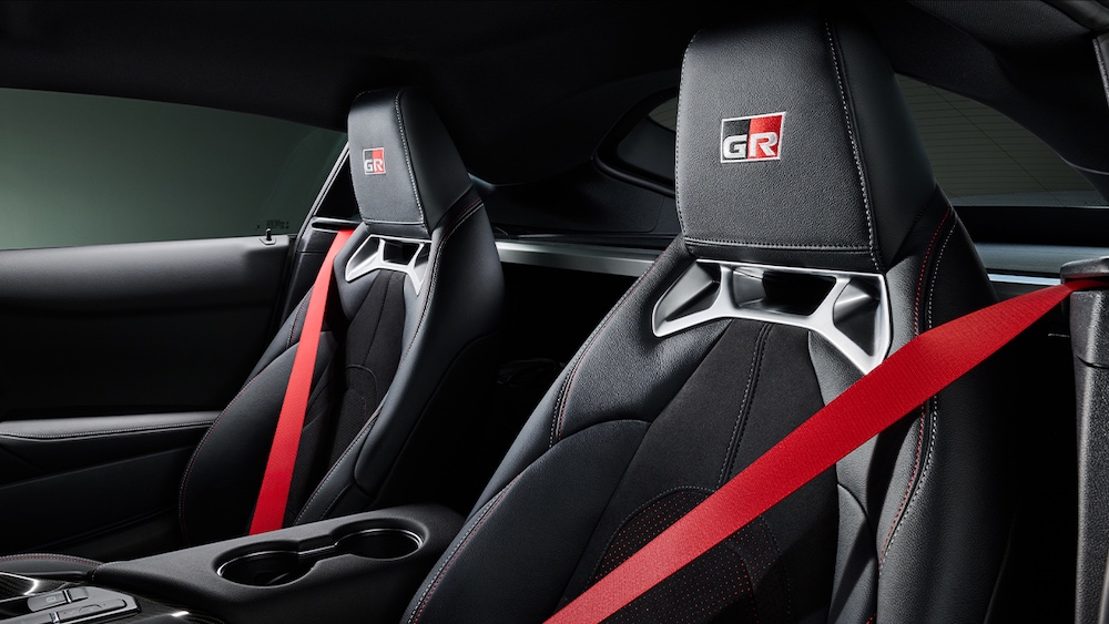 Ciri dalaman Toyota GR Supra Track Edition 2025 menampilkan kemasan Alcantara hitam dan kulit, tali keledar merah dan sistem audio JBL dengan 12 pembesar suara.