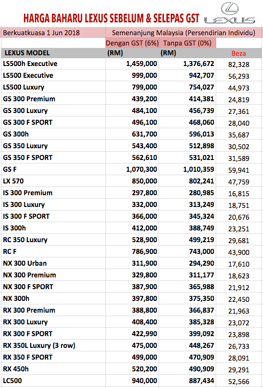 Toyota Vios 1.5J automatik misalnya menunjukkan penurunan sebanyak RM4,398 selepas pemansuhan GST. Paling banyak harga diturunkan ialah model Toyota paling premium, Alphard 3.5 Executive Lounge, iaitu sebanyak RM30,457.