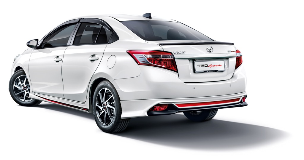 - Vios TRD (varian paling premium) dipasangkan kit badan lebih sporty berupa pelekat strip berwarna, dan perumah cermin sisi hitam. Kit eksklusif rekaan TRD Asia itu bukan hanya gaya, tetapi juga meningkatkan aerodinamik.