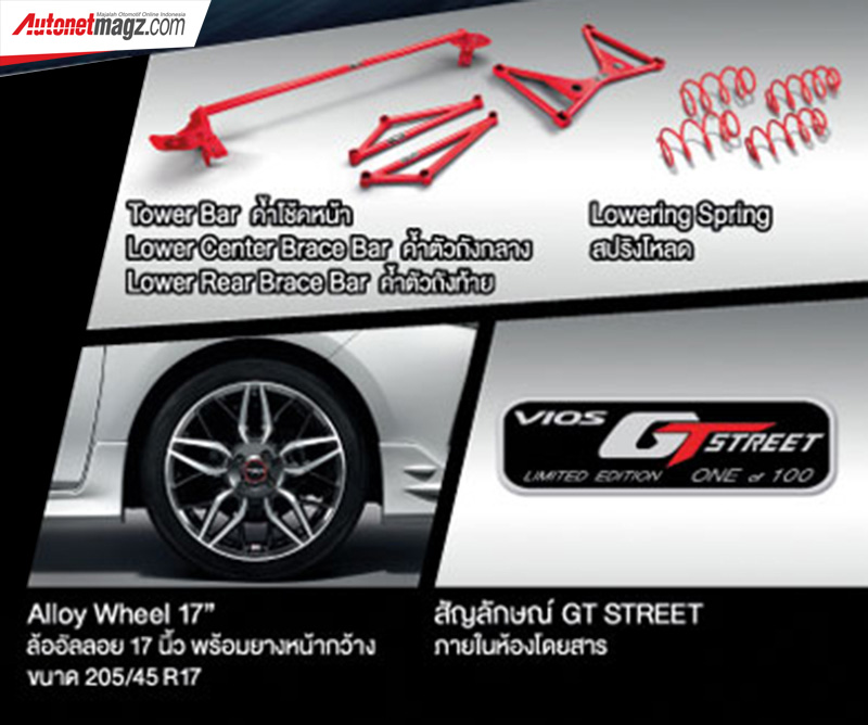 MODEL yang anda lihat ini hanya dikeluarkan untuk pasaran Thailand. Jadi kepada peminat Malaysia, harap berpuas hati dengan model Vios sedia ada. Toyota Vios GT Street versi Negara Gajah Putih itu cuma dikeluarkan 100 unit dengan menampilkan beberapa pengemaskinian kosmetik.