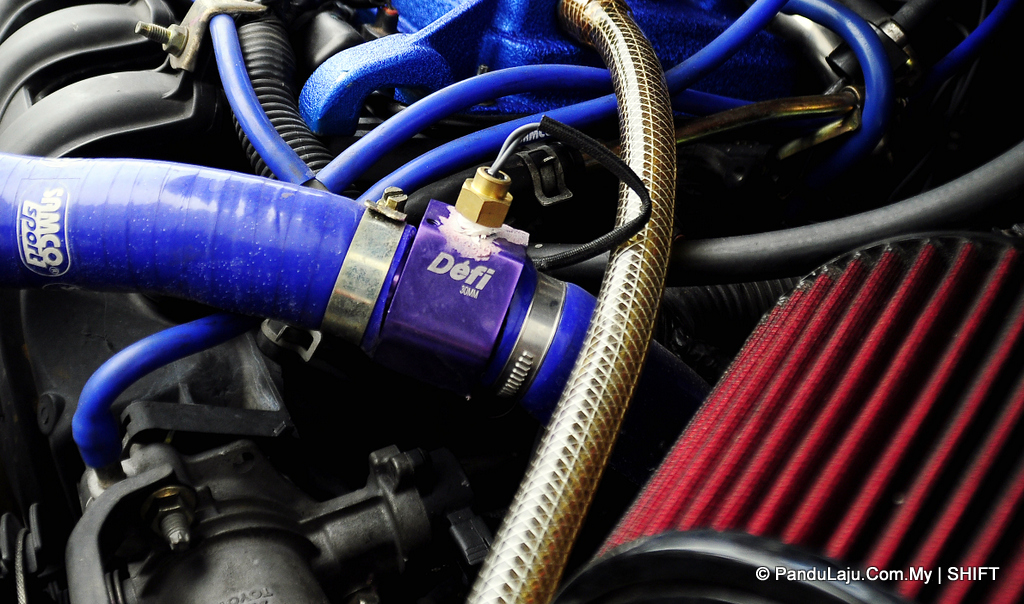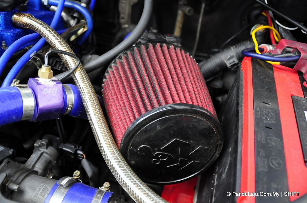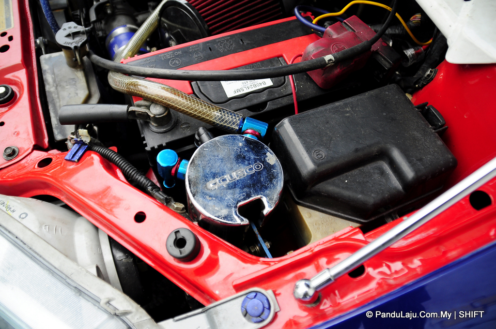 Bahan api dari tangki utama pula disalurkan terus ke bahagian enjin dan dilaraskan oleh pelaras bahan api Works sebelum dihantar ke dalam ruangan kebuk pembakaran. Turut kelihatan unit ‘oil catch tank’ Cusco dipasang bagi mengelakkan minyak pelincir buangan memasuki semula ke dalam bahagian enjin.