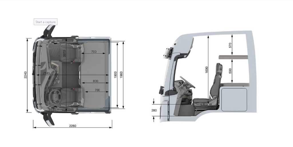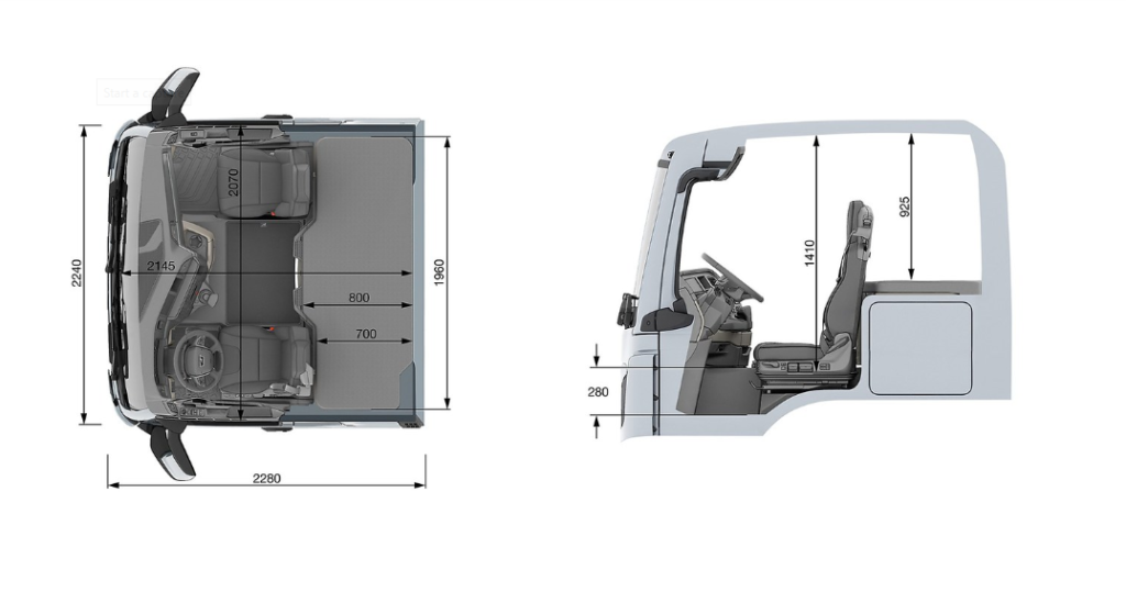 Kedua-dua trak memiliki dimensi lebar (2,240mm) dan panjang (2,280mm) sama, termasuk tambahan 280mm untuk ruang kelegaan kepala yang memberikan esktra ruang untuk pemandu berdiri, bergerak atau memunggah simpan barang lebih selesa.
