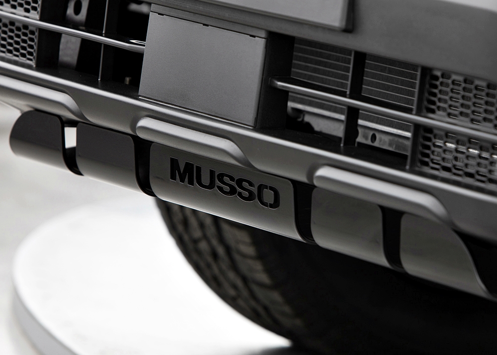 - Plat skid (skid plate) hitam dan logo Musso.