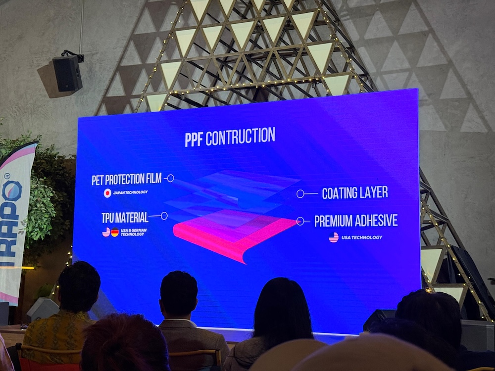 Filem PPF itu dihasilkan daripada bahan poliuretana termoplastik (TPU) dari Jerman, pelekat dari AS dan salutan teknologi Jepun dengan waranti produk hingga 10 tahun, bergantung ketebalan filem.
