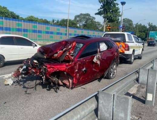 Daripada video dikongsikan dalam laman X, SUV tersebut rosak teruk dengan enjin tercabut ke tengah jalan.