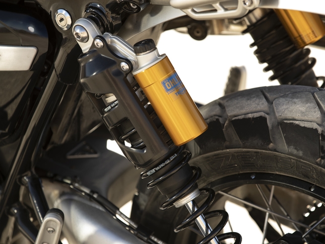 Frem Scrambler 1200 baharu ini turut direka semula yang bukan saja mampu menampung kapasiti enjin, tetapi juga menyerlahkan profil jentera yang lebih tinggi. Tiada angka mengenai jarak kelegaan tanah dimaklumkan, tetapi tinggi pelana XE ialah 870mm (berbanding Street Scrambler 792mm), sedikit tinggi. Sistem suspensi menggunakan fork USD boleh laras Showa dengan travel 250mm di depan dan absorber Öhlins 250mm di belakang.