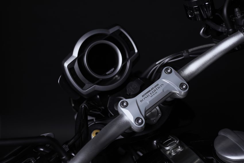Scrambler 1200 Bond Edition mendapat skema warna Black Sapphire (hitam) dengan lencana Triumph pada tangki minyak dan pad lutut dengan trim emas lukisan tangan. Lencana 007 turut tertera pada ekzos, termasuk dipaparkan pada skrin meter apabila enjin dihidupkan. Pelana pula daripada kulit asli premium berserta sulaman logo.