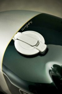 - Perincian termasuk cermin hujung hendal, lencana penutup klac dan alternator bergaris, penutup bolt kepala silinder hitam serta pad lutut pada tangki.