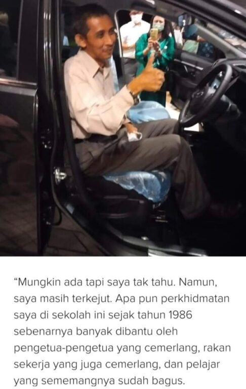 Lebih manis, kenderaan utiliti sukan (SUV) itu dihadiahkan bekas pelajarnya dari tahun 1980 hingga 2021 yang sama-sama bersatu hati mengumpul duit untuk membeli model tersebut secara tunai.