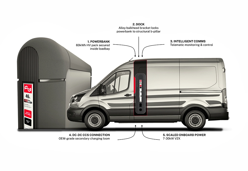 Untuk van yang tidak dapat dicas di kediaman atau kembali ke depot, teknologi bank kuasa Vehicle ReCharge menyediakan pengecasan semalaman di mana-mana lokasi.