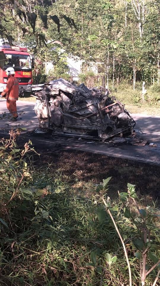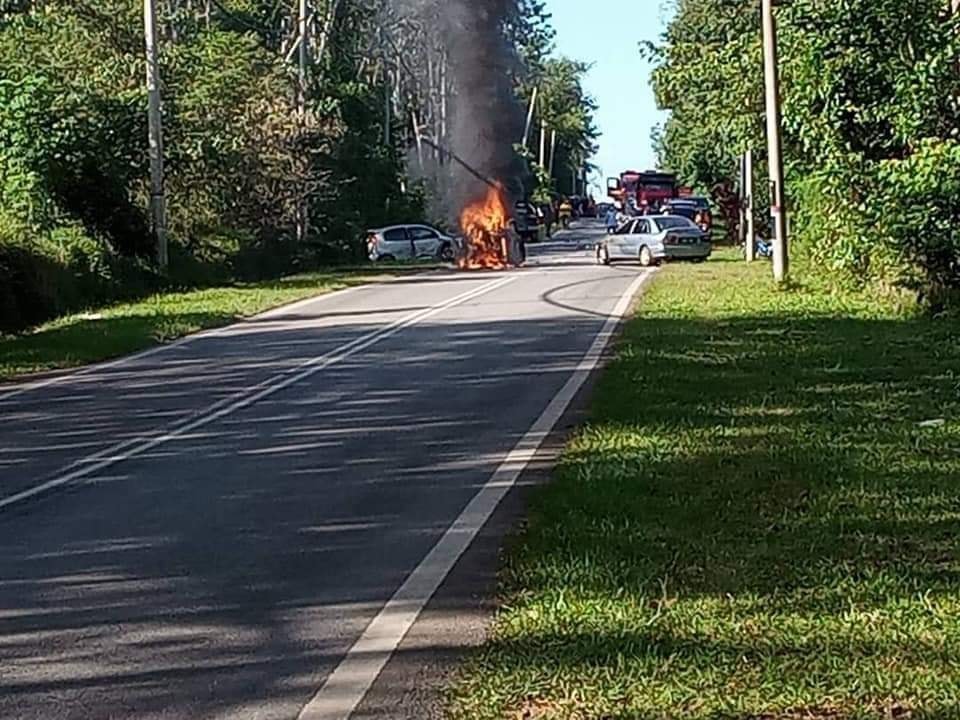 SEBUAH Perodua Viva terbakar selepas terlibat dalam kemalangan membabitkan lima kenderaan di Jalan Sungai Jagung, Padang Pusing, Pendang, Kedah, semalam yang menyebabkan tokoh agama, Yahya Asy’ari, 65, meninggal dunia dalam kenderaan dipandunyanya.