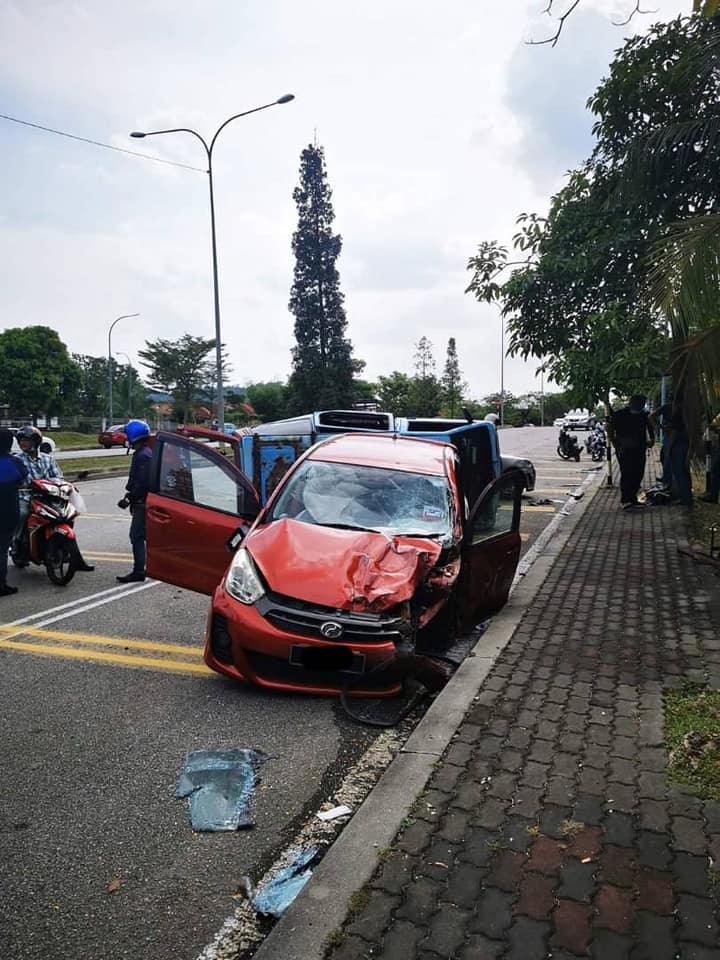 POLIS menahan pemandu kereta jenis Perodua Myvi yang merempuh kuat sebuah van dan Proton Waja di Jalan Bandar Kinrara 6F, Bandar Kinrara, dekat Serdang, Selangor, pada jam 2 petang semalam.