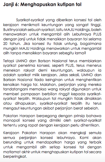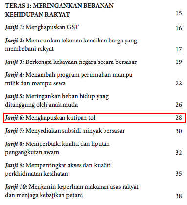 Janji menghapuskan tol ada tertulis dalam ‘Buku Harapan – Membina Negara Memenuhi Harapan’ di bawah Janji 6 halaman 28 di bawah kategori Teras 1: Meringankan Bebanan Kehidupan Rakyat.