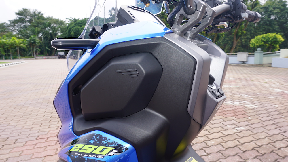 Ruang simpanan bawah pelana agak besar dan tiada masalah meletakkan komputer riba 13, kamera digital, powerbank seberat 1.1kg, sepasang kasut sniker, baju hujan dan botol air mineral 1.5 liter.