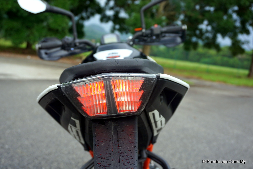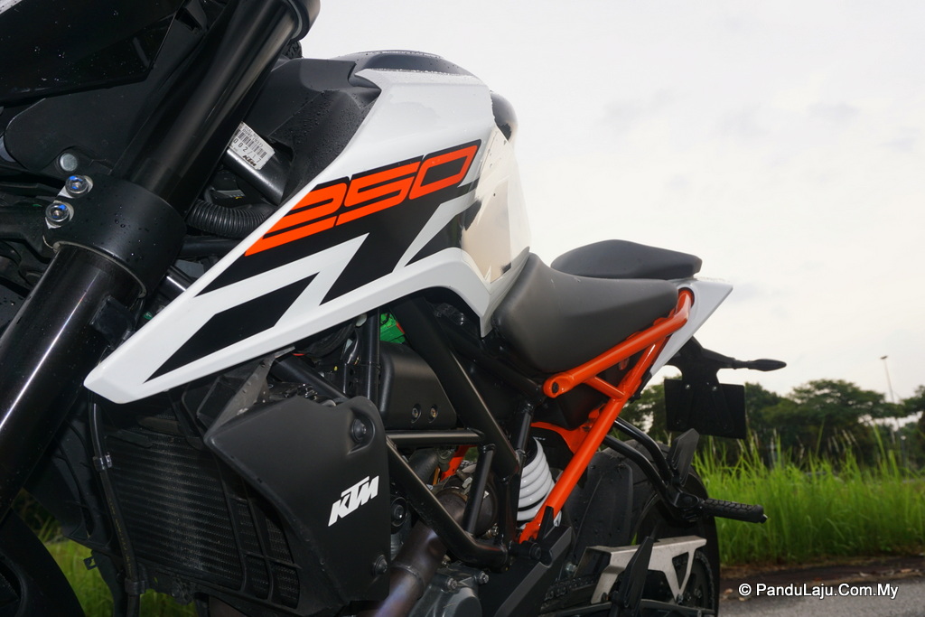 Berita kurang enak pula, pelana 250 Duke baharu ini 30mm lebih tinggi berbanding versi terdahulu. Jika saya yang berketinggian 1.78m pun sudah rasa payah menjejakkan kedua-dua tapak kaki, apatah lagi penunggang lebih rendah. 250 Duke (2017) mungkin lebih mencabar untuk ditunggang dalam bandar, terutama ketika berhenti di lampu isyarat.
