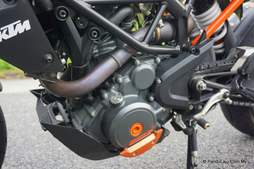 Pada rev awal di bawah 4,000rpm, enjin silinder tunggal 250 Duke terasa sebu, seakan malas bergerak. Situasi itu cukup terasa ketika menunggang dalam keadaan lalu lintas sesak. Respon pendikit juga kurang sensitif, dan agak sukar menyelit di celahan kenderaan lain yang lebih besar. Hanya selepas terotel dikerah, barulah terasa hamburan kuasa yang lebih kuat hingga mencecah 120kmj.