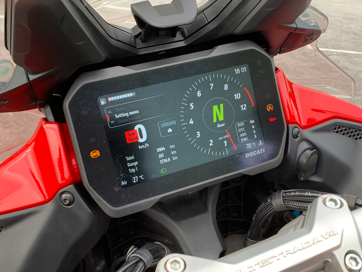 Panel meter TFT baharu ini juga menawarkan fungsi hebat. Jika skrin lain membolehkan anda melaraskan mod enjin, kawalan traksi, karakter suspensi, menjawab panggilan telefon, memainkan muzik, dan panduan navigasi (GPS), panel meter Multistrada V4 S ini membolehkan anda melihat paparan skrin telefon sendiri (smartphone mirroring) menerusi pautan wayarles sama ada secara Bluetooth atau WiFi.