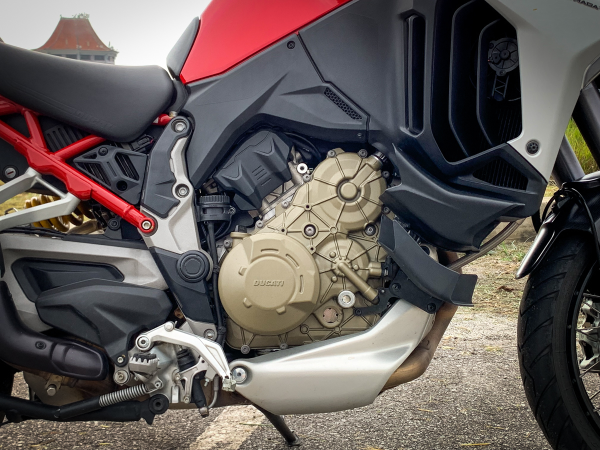 Seperti anda maklum, Multistrada V4 S dijana enjin V4 yang ditala daripada enjin Panigale V4 dengan sesaran enjin sama 1,158cc. Enjin ini digelar Granturismo, dikhususkan untuk tunggangan jelajah. Jadi, ia tidak menggunakan sistem injap ‘Desmodromic’, sebaliknya tren injap biasa dengan jarak servis pelarasan injap setiap 60,000km.