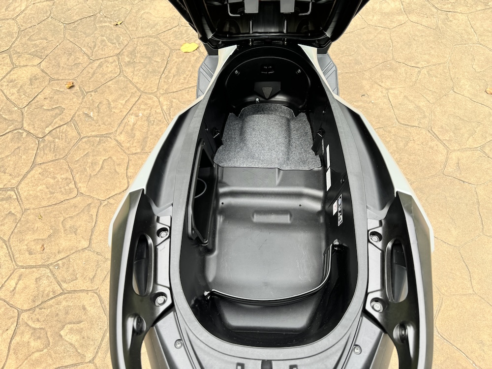 - Ruang simpanan 48 liter cukup untuk memuatkan sebuah helmet saiz biasa dan kecil atau separuh, selain barangan peribadi seperti baju hujan atau beg kecil.