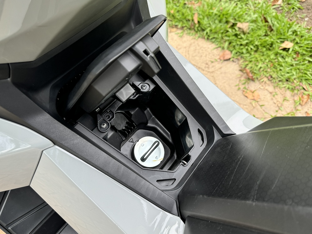 - Bukaan tangki petrol dan pelana menggunakan butang. Sangat mudah digunakan kerana skuter ini dilengkapi sistem penghidup tanpa kunci (keyless).