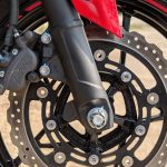 Namun, ia tidak terlalu menjejaskan prestasi brek dan pengendalian jentera ini. Brek depan cukup menggigit ketika tuil ditarik, hasil cengkaman kaliper Nissin 2-piston kembar pada cakera tunggal 310mm, 20mm lebih besar daripada model lama. Bersama kombinasi klac sliper (slipper clutch), proses memperlahankan kelajuan di selekoh atau berhenti sepenuhnya berjalan lancar tanpa sebarang drama tidak diingini.