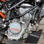 • Sebelum terlupa, enjin 200 Duke lama terasa sangat panas kerana paip ekzos berada sebelah kiri enjin. Sebaliknya, paip ekzos baharu pula turun terus ke bawah enjin. Jadi, bahang enjin tidak terasa langsung. Kipas pula tidak kerap aktif seperti model dahulu kerana enjin baharu kini lebih sejuk.