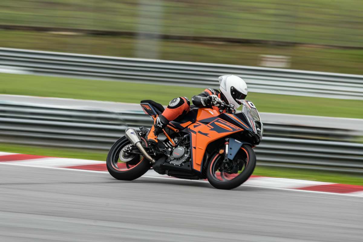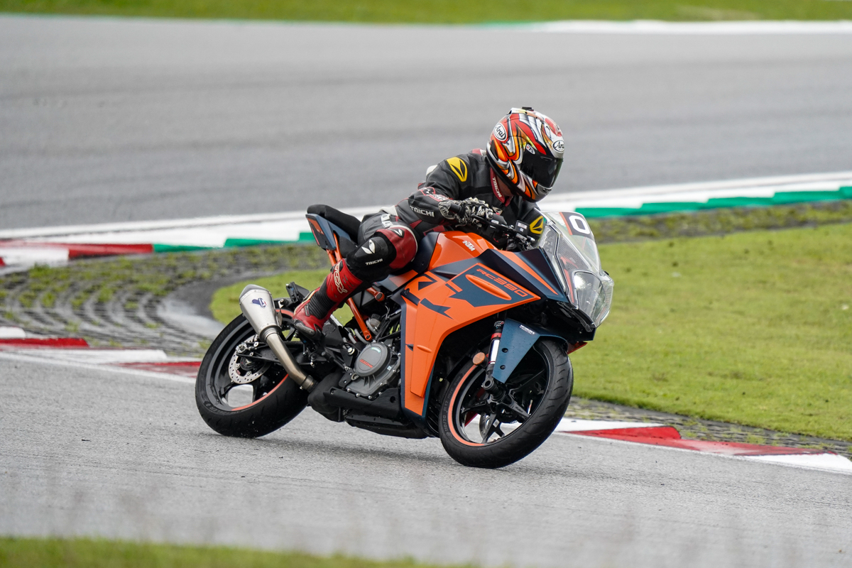 Memang malang terpaksa menunggang atas trek basah kerana saya memang berhasrat mahu menguji KTM RC 390 (2022) semaksimum mungkin hingga ke tahap cecah lutut. Namun, saya rasa hanya segelintir pemilik saja yang akan menunggang motosikal ini di litar.