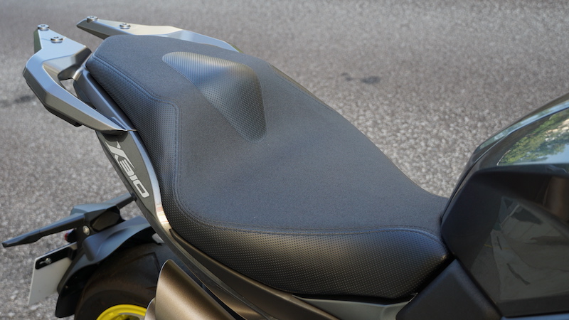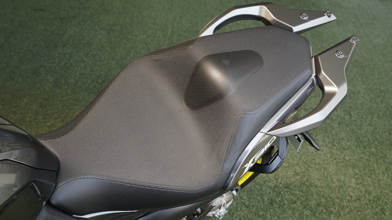- Pelana dibalut dua material jenis kesat di tengah dan separa licin pada sisi. Jika menggunakan brek depan secara mengejut masih boleh menggelongsor. Apapun, pelana agak empuk dan cukup lebar kerana punggung tidak rasa lengguh.