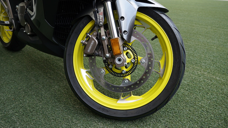- Kecekapan brek dengan teknologi Sistem Brek Anti-Kunci (ABS) memang berkesan dan jelas dapat dirasai. Tayar model ini juga menggunakan produk China, tetapi pendapat saya tiada masalah untuk jalan kering atau basah. Grip pun okay.