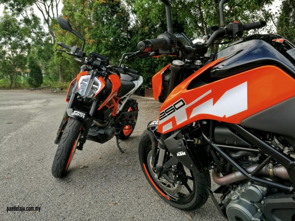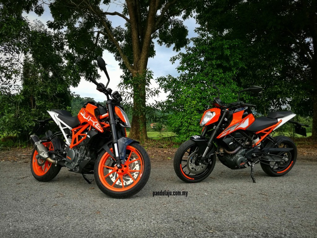 Selain sesaran enjin dan penampilan kosmetik, tiada banyak perbezaan antara 250 Duke dan 390 Duke. Kedua-dua motosikal ini berkongsi komponen kerangka dan tayar Metzeler Sportec M5 bersaiz sama. Cuma 390 Duke lebih superior dengan kelebihan enjin 373cc yang mampu memberikan pecutan lebih padu, tetapi masih mudah dikendalikan walaupun anda dalam kategori penunggang kurang berpengalaman dengan jentera berkuasa tinggi.