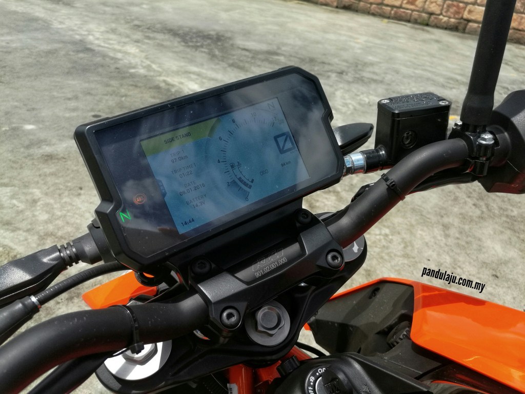 Saya menguji 390 Duke (2017) untuk perjalanan pulang. Apabila kaki melangkah pelana, mata saya terus tertarik kepada panel meter. Kualiti paparan instrumen LCD TFT berwarna sangat baik dan jelas dipandang walaupun ditunggang di bawah sinaran matahari terik.