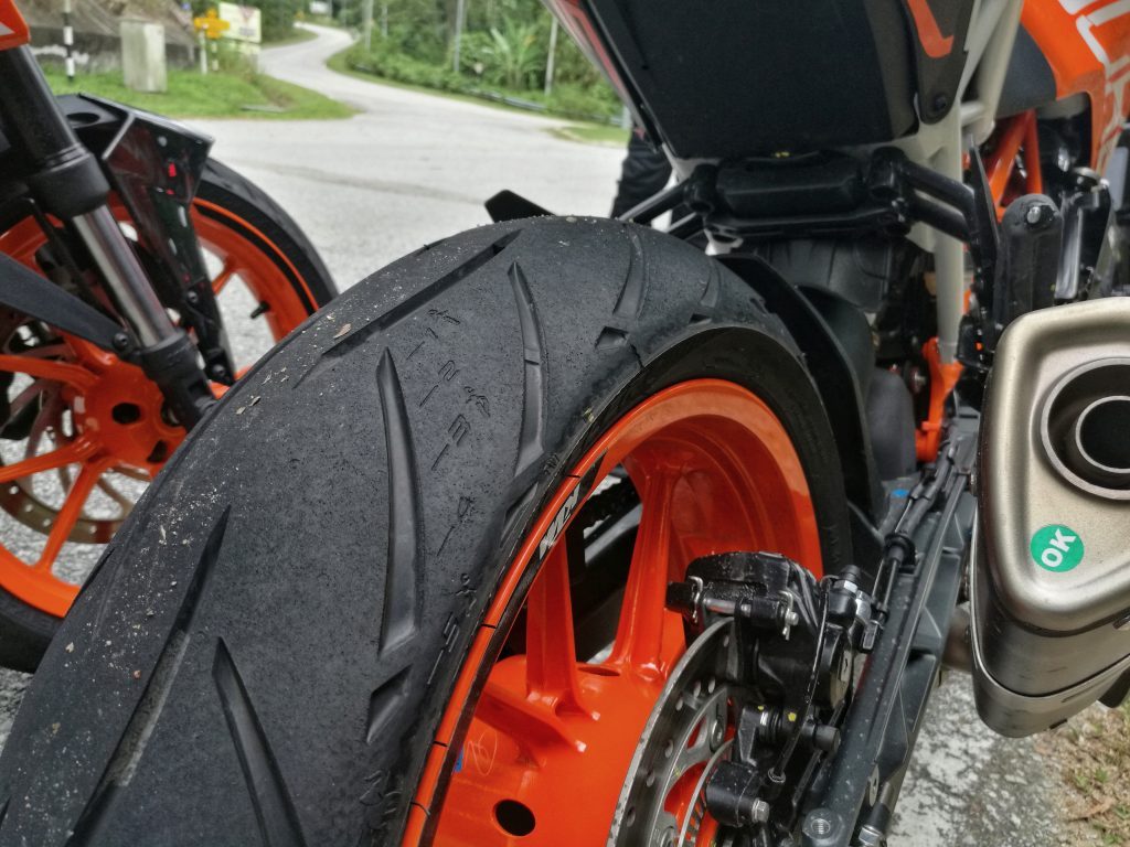 Menyentuh bab tayar, 250 Duke ini menggunakan sepasang tayar Metzeler Sportec M5 berukuran 110/70 ZR 17 (depan) dan 150/60 ZR 17 (belakang) yang menggantikan unit Pirelli Diablo Rosso II pada model terdahulu.