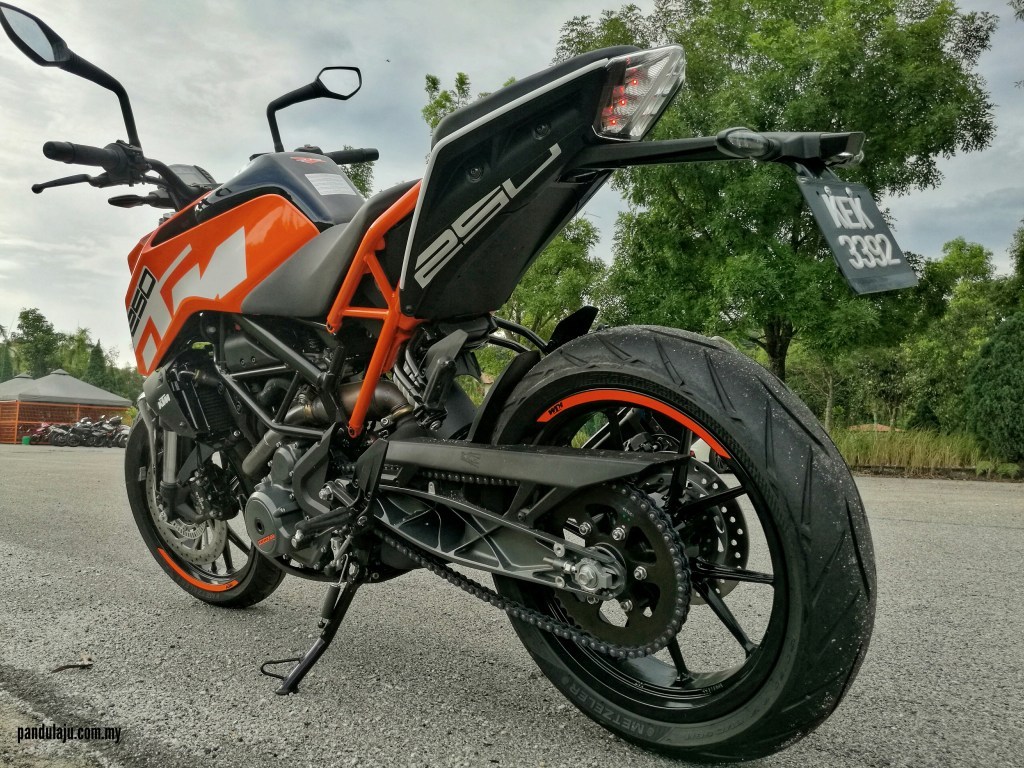 Memang terbukti pengendalian 250 Duke (2017) cukup sempurna. Malah, ketika menyusuri selekoh pendek, motosikal ini masih berupaya menghambat dan mengikuti abangnya, 390 Duke yang lebih berkuasa. Walaupun prestasi enjin model 2017 ini masih sama seperti dahulu, dari segi ergonomik lain pula ceritanya. Rekaan kerangka baharu lebih tegar, posisi hendal dan alas pemijak sporty serta kehadiran teknologi bantuan penunggang, termasuk tayar Metzeler yang cukup gigitan jelas memberi lebih keyakinan untuk saya menguji potensi jentera ini semaksimum mungkin.