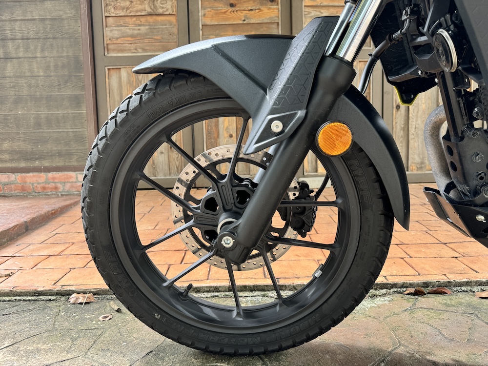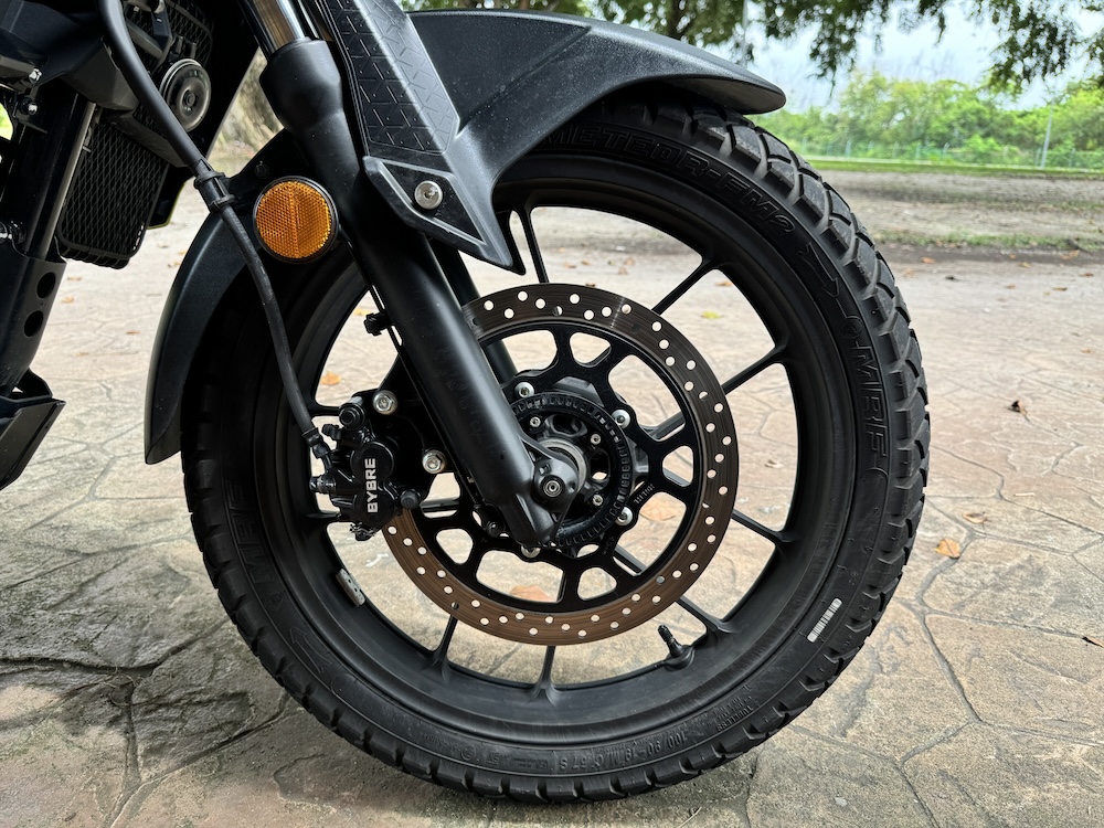 - Fork depan walaupun jenis teleskopik konvensional dan tidak boleh laras, tetapi masih mampu bekerja dengan baik sepanjang tunggangan dengan bantuan monoshock di belakang.