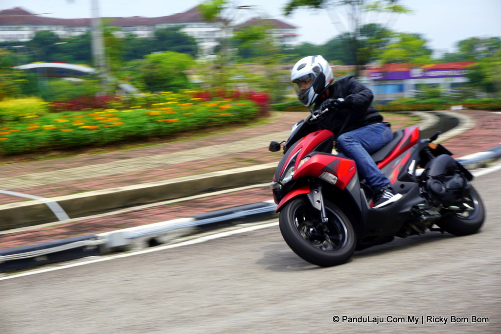 Namun, andaian saya meleset kerana ketika sesi menunggang uji dilakukan sekitar bandar raya Shah Alam yang terkenal dengan julukan ibu kota roundabout dan lampu isyarat itu, jelas menyerlahkan kelebihan transmisi automatik CVT yang digunakan. Tanpa perlu pedulikan tentang klac dan menukar gear, sebaik saja lampu isyarat hijau, saya cuma perlu pulas dan skuter ini terus meluncur deras hingga tanpa sedar meter sudah melebihi 90kmj sebelum terpaksa pula berhenti di lampu isyarat seterusnya. Hehehe.