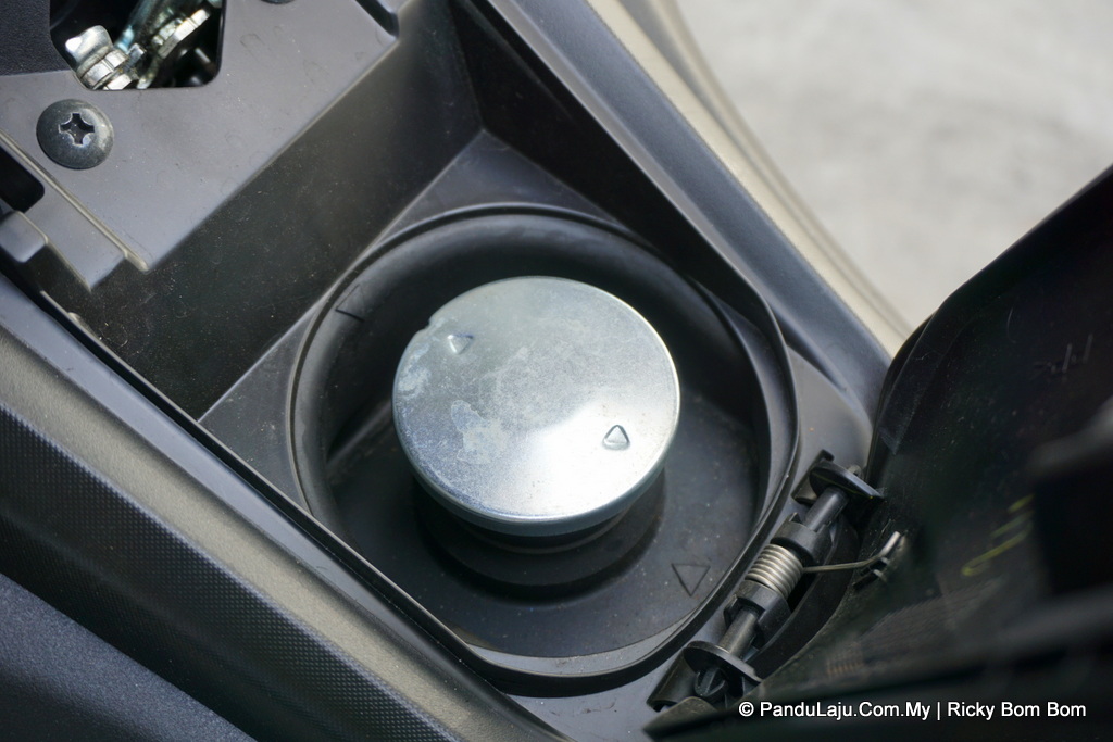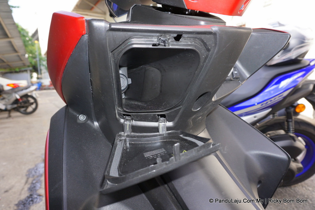 Melengkapkan lagi gaya hidup digital, skuter ini disiapkan dengan soket 12v yang diletakkan di ruang simpanan sekitar tombol kunci. Kini anda boleh mengecas telefon pintar dan peranti mudah alih pada bila-bila masa. Namun, saya berpendapat kehadiran ruang simpanan ini masih boleh dipertingkat. Antaranya, saiz ruang agak kecil yang menyukarkan telefon pintar bersaiz besar disimpan. Rekaan sudut ruang simpanan dan penutup pula kurang meyakinkan. Risau pula kalau telefon kesayangan tergelongsor keluar tanpa dikesan.