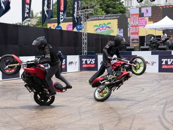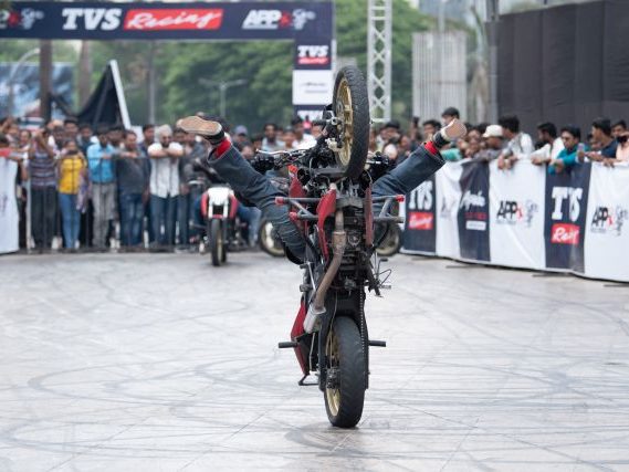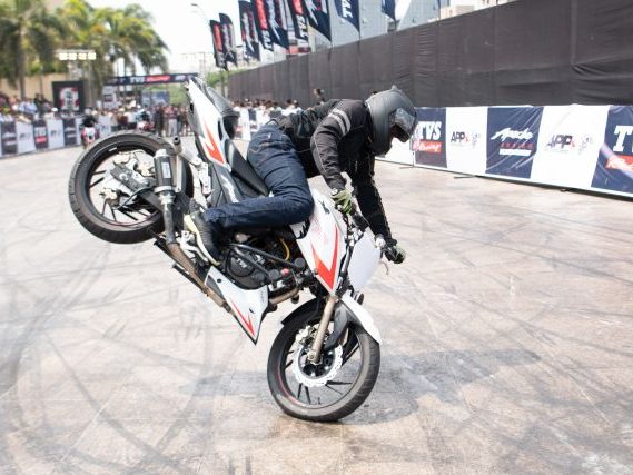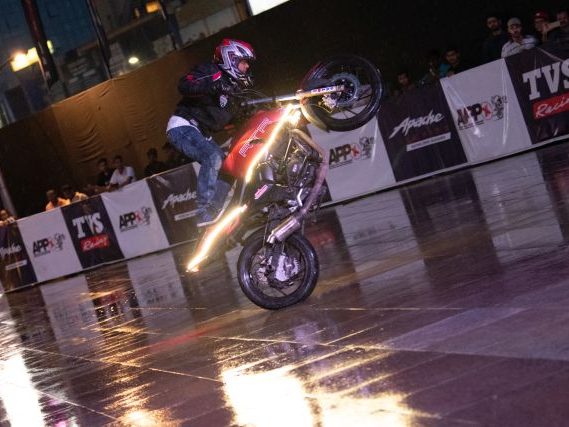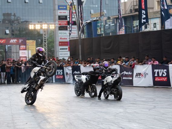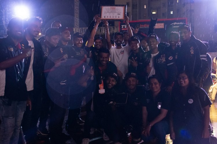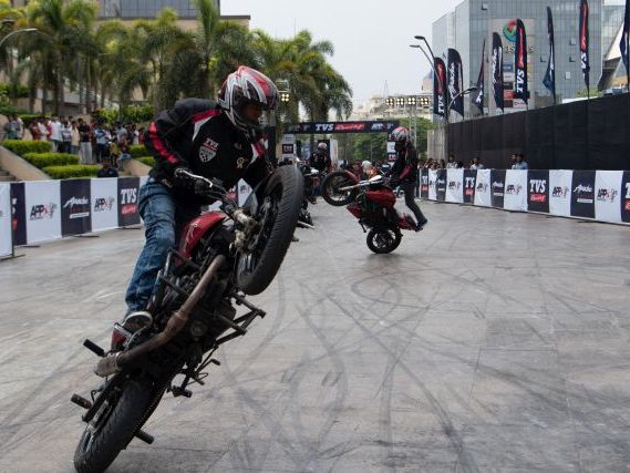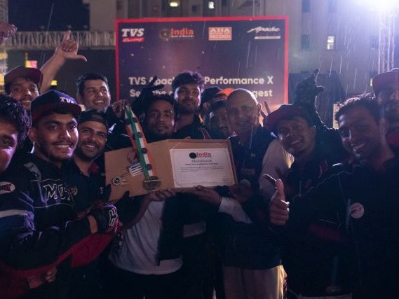 Rekod itu, yang dibuat sempena acara Apache Pro Performance di Pune, India anjuran TVS Motor Company, melibatkan lima penunggang lagak ngeri dari lima bandar: Bangalore, Coimbatore, Indore, Jaipur dan Delhi.