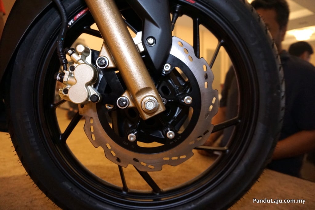 Keselesaan tunggangan ditugaskan kepada suspensi fork teleskopik 37mm (depan) dan monoshock KYB (belakang), manakala kuasa henti menggunakan khidmat brek cakera 270mm (depan) dan 240mm (belakang). Bahagian roda dipadankan rim 17 inci dengan balutan tayar Pirelli bersaiz 90/90 (depan) dan 130/70 (belakang).