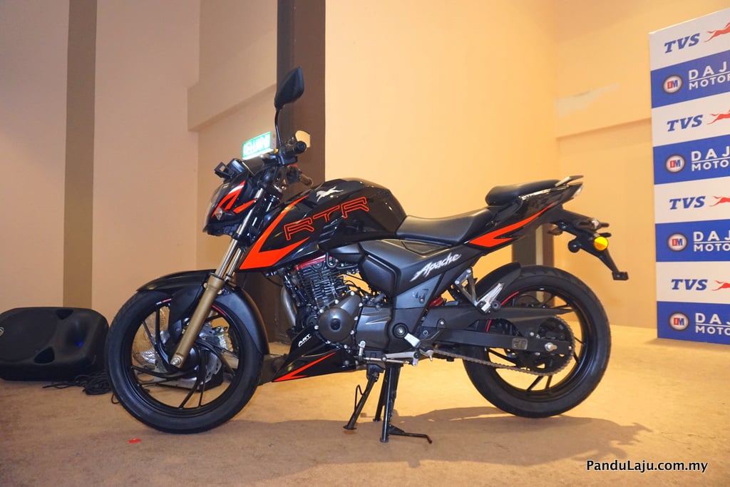 MODEL streetbike, TVS Apache RTR 200 4V akhirnya tiba di Malaysia. Kepada anda yang mungkin tidak tahu, TVS ialah jenama produk motosikal buatan TVS Motor Company, iaitu pengeluar motosikal multinasional yang berpangkalan di Chennai, India.