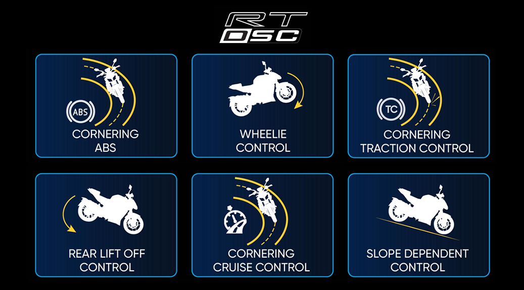 - Ciri bantuan penunggang dilengkapi ABS, sistem kawalan traksi (TCS), kawalan jelajah belok , Sistem Pemantau Tekanan Tayar (TPMS), dan quickshifter.
