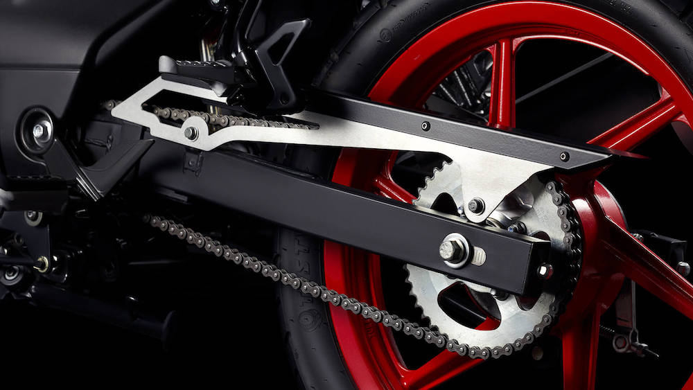 Sistem transmisi jenis manual-5-kelajuan, manakala sistem suspensi menggunakan fork teleskopik tidak boleh laras di depan, dan monoshock boleh laras prabeban di belakang.